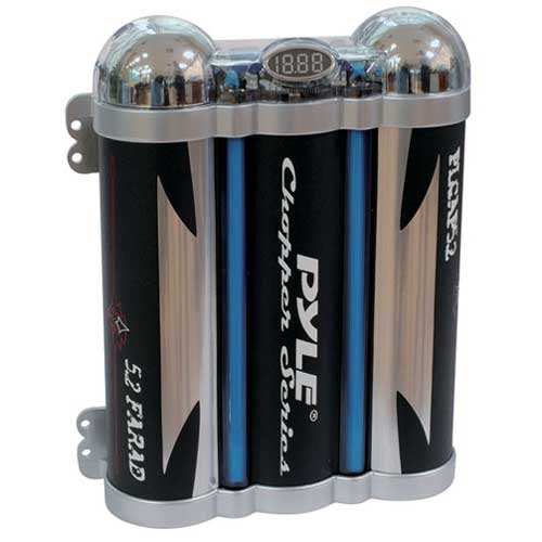 A great sound system needs a great capacitor: a high-demand audio setup can often place extra demand on your car’s electrical system. When you need power, especially for booming bass and soaring highs, this 5.2 farad Pyle Chopper-series capacitor will have it at the ready. And it’s got all you need to make sure your system sounds awesome and stays safe: a red digital voltage readout to show you how much power is available, electronic polarity protection, and an over voltage protection circuit. And this won’t just make your system sound great – it looks great too, thanks to the blue neon accent lighting. Includes clear Lucite brackets and mounting hardware for easy installation.PYLE PLCAP5.2 5.2 Farad Triple Link Capacitor with Blue Neon Specifications | Sale - Review & Buy at Cheap Price